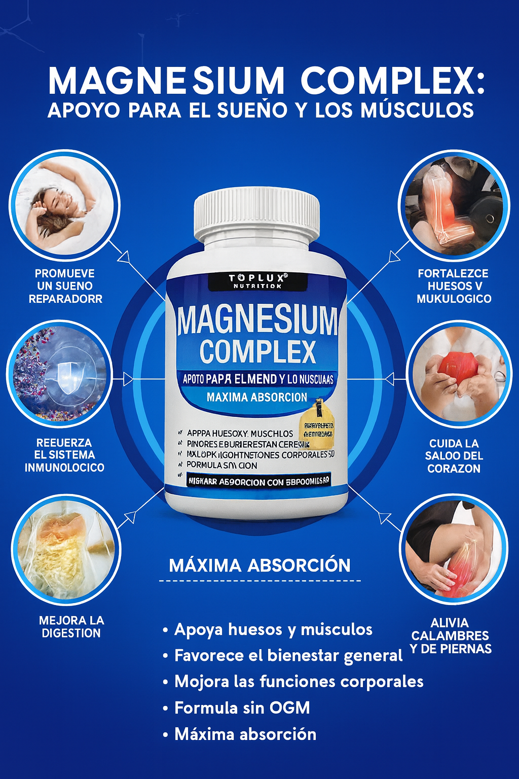 Magnesium Complex de Toplux Nutrition combina 8 formas de magnesio de máxima absorción para reafirmar músculos y pechos, aliviar dolores, reducir la inflamación y prevenir calambres. Un suplemento probado en laboratorio, fabricado en EE. UU. y libre de OGM.